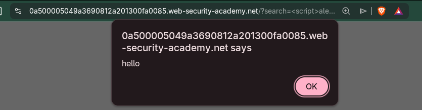 With this confirmation, it was time to perform the final attack. I injected the following JavaScript payload into the search box: <script>alert('hello')</script>
