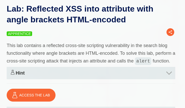 In this lab, the goal is to inject JavaScript code and successfully call the alert() function to demonstrate a reflected cross-site scripting (XSS) vulnerability. Click “ACCESS THE LAB” to begin.