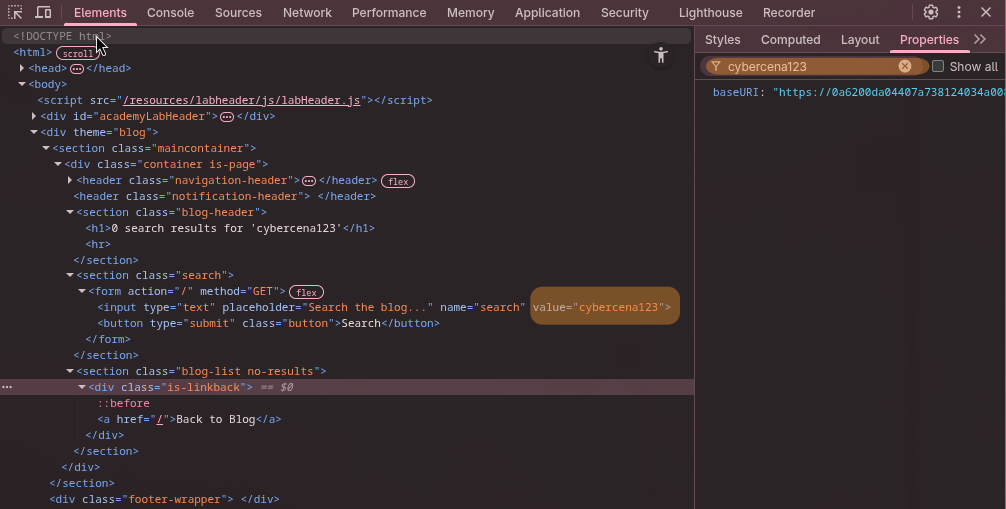 This time, instead of relying on the rendered output, I inspected the page source. Using the browser’s Developer Tools and the search feature, I searched for the injected keyword.