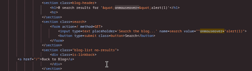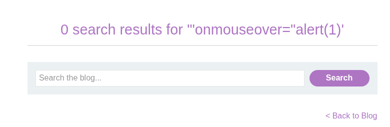 <input type=text placeholder='Search the blog...' name=search value="" onmouseover="alert(1)">