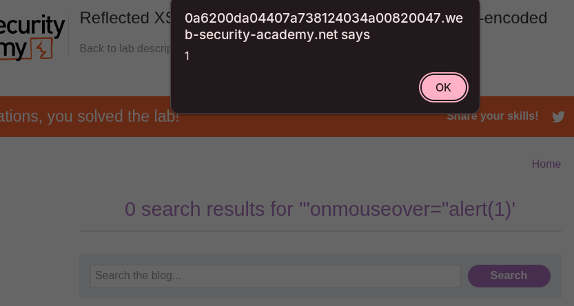 Now, whenever the mouse cursor is moved over the search input field, the JavaScript alert(1) function is triggered, resulting in a popup.