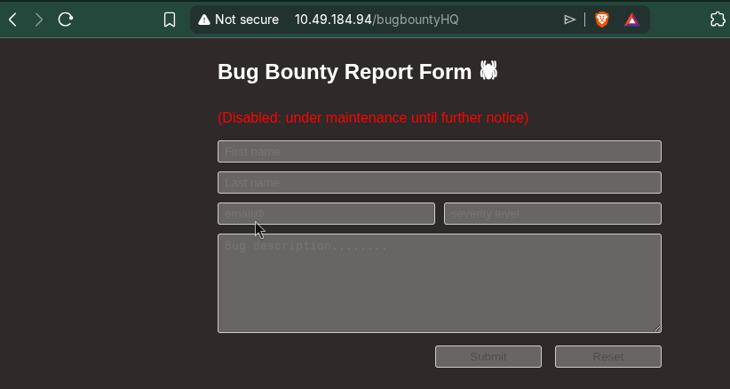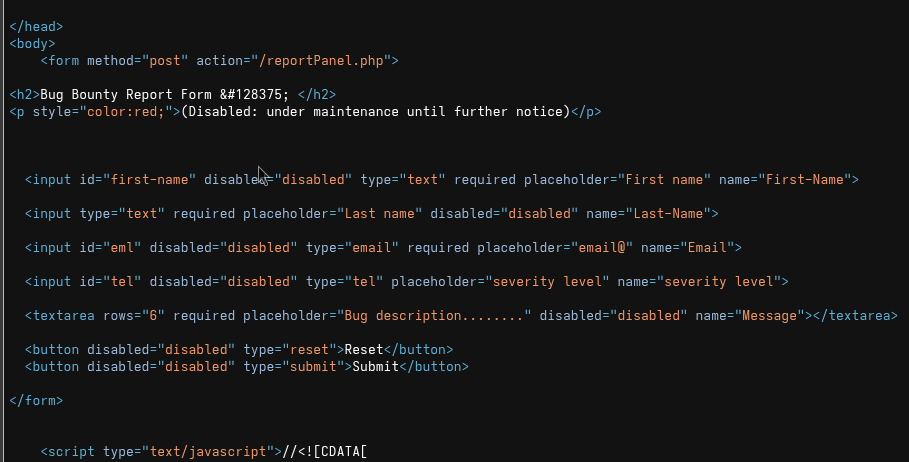 You will get a form, but the input is disabled. So, I checked the page source using Ctrl + U and found a new directory: /reportPanel.php.