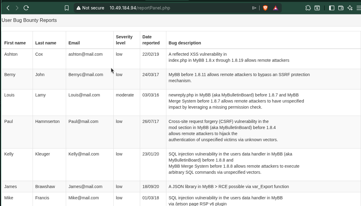 The attack is going to take a long time to obtain the credentials by brute-forcing the user, so I decided to work on the hidden code that we obtained earlier from /reportPanel.php. I noticed that: