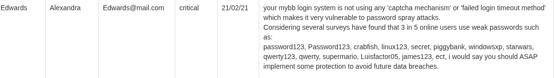 To exploit the vulnerability suggested by Edwards, we need a list of users and passwords. We can use the passwords provided by Edwards in the report.