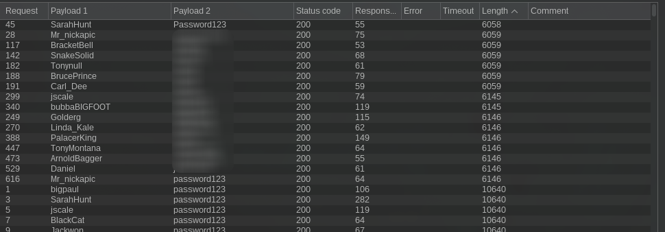We can see a username and password combination with a different response length compared to normal traffic.