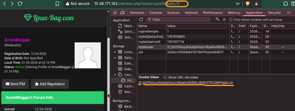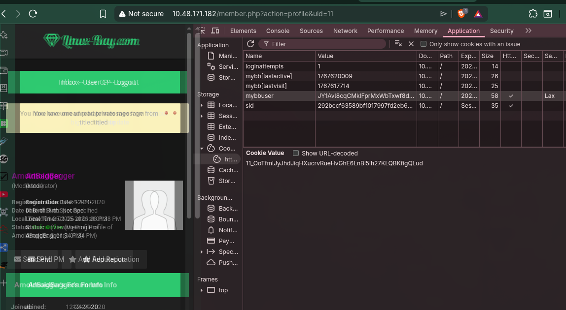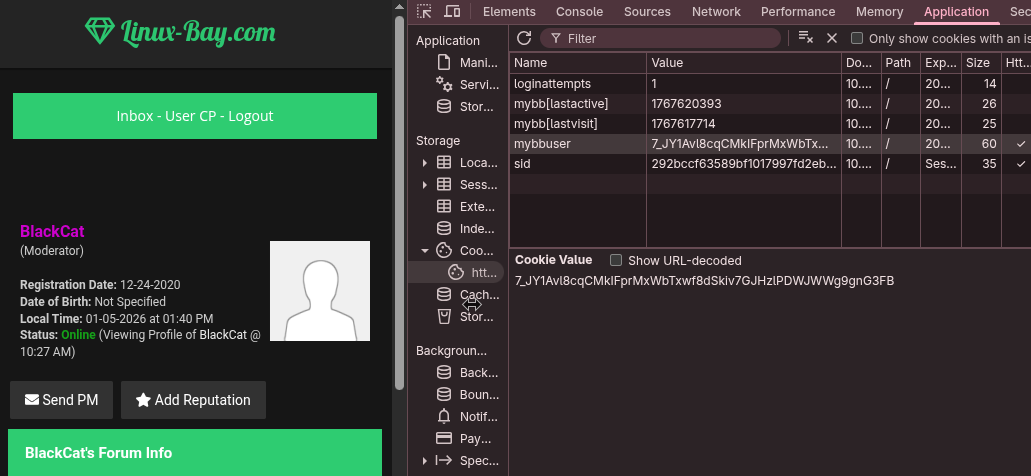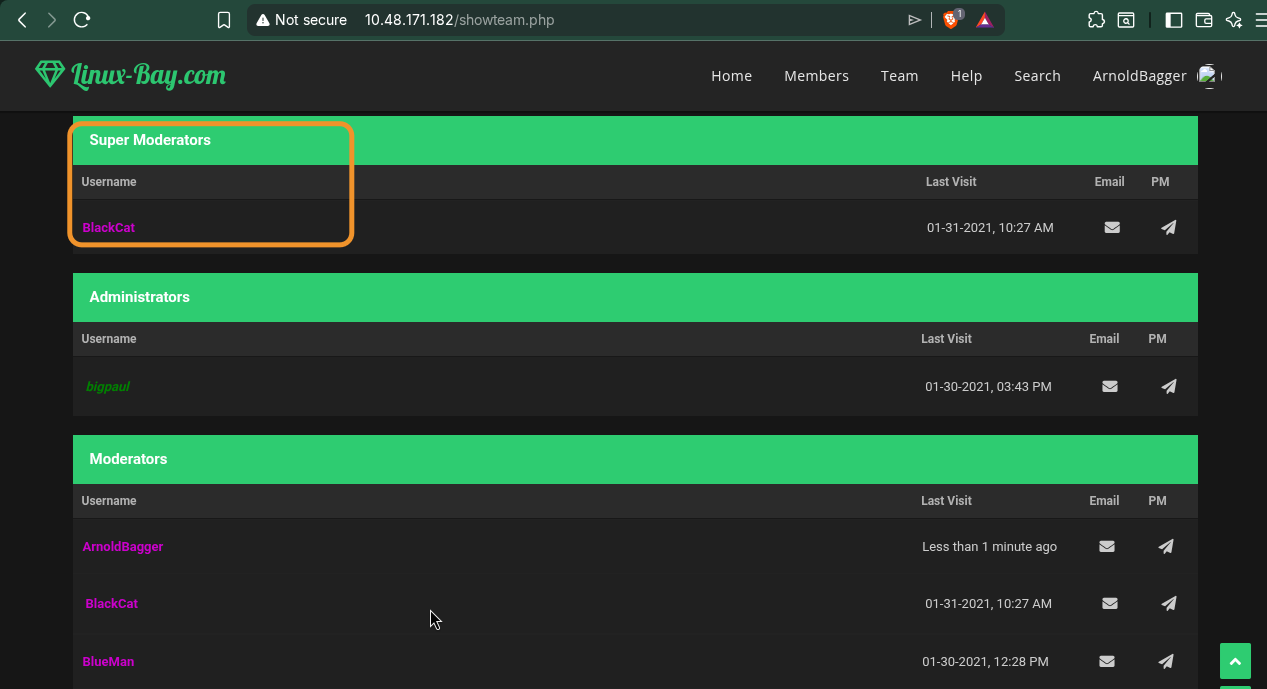 Among them, I found bigpaul as an administrator of the linux-bay system, but we don’t have his login_key. So, I selected BlackCat, who is the SuperModerator of the system.